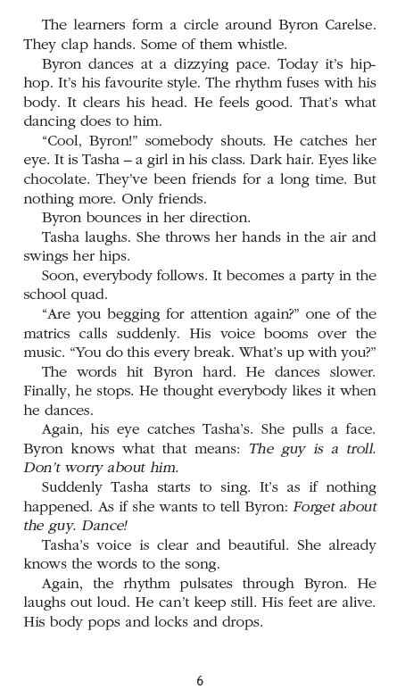 Dreamers Books for Schools Books for Teenagers English by Fanie Viljoen - 19th May 20228th May 20230 Dancing is Byron Carelse’s life. It’s his energy, his passion, his happy place … his spark. When the rhythm takes hold of his body, he forgets about all the troubles waiting for him at home. His best friend Tasha says he shouldn’t allow other people to steal his spark. But she doesn’t have a clue about the things going on in Byron’s home. And perhaps it’s better that way. What will she think of him? One day, somebody spots Byron’s talent. Along with a group of other township kids, he gets the opportunity to take part in a show at a big arts festival. But what are you supposed to do when life tries to steal your dream from you? Struggling readers Dreamers is suited for struggling readers. It is classified as a high content / low reading level book. Buy Dreamers is available in all good bookshops and online at Takealot. Order from Loot. You can even buy it from Amazon. Order the ebook from Lapa Publishers. Afrikaans Dreamers is translated from the Afrikaans book Dromers. If you struggle to read Afrikaans, get both books and read them side by side. Video Watch a short video. https://www.youtube.com/shorts/UWN-IAipgFE Excerpt Share on Facebook Share 0 Share on TwitterTweet Share on Pinterest Share 0 Share on LinkedIn Share Share on Digg Share 0 Total Shares
